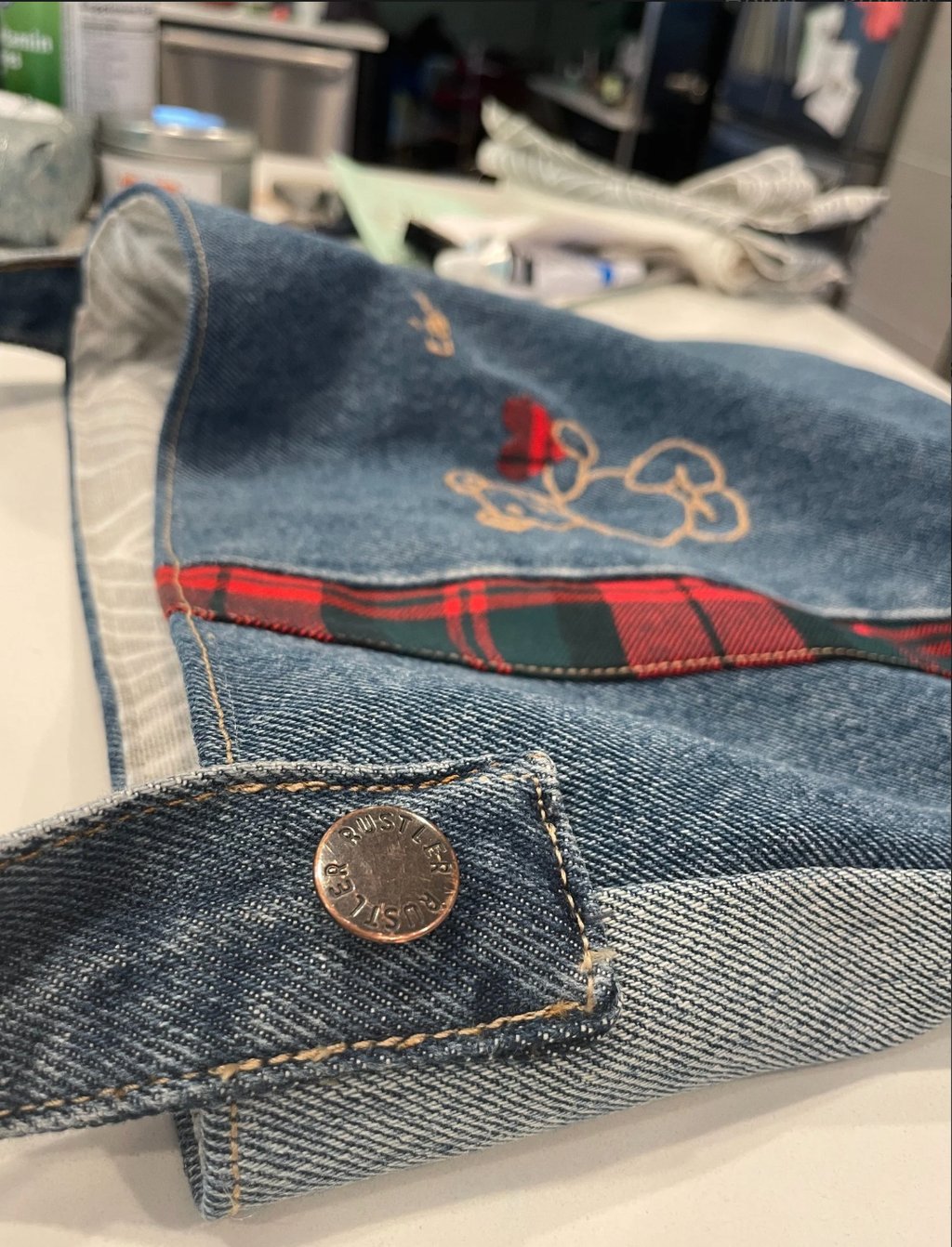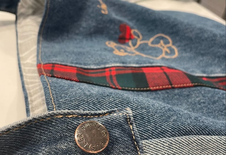 The back pocket is taken straight from a pair of jeans, and another lighter-washed jean, as well as a plaid fleece, is used for the accent strip.