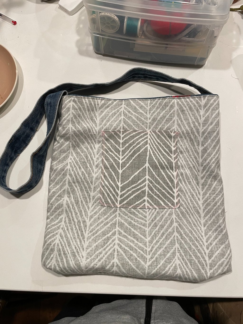 I made this tote bag for a friend's birthday. Sewing denim is always tricky, as the fabric is thick and specific needles must be used, but I incorporated different materials in it as well, including fleece and polyester. As usual, I up-cycled old denim jeans and even incorporated features of the jeans into the bag. The rest of the fabric is what I found around the house. My friend loved the bag and I loved making it.