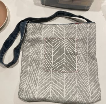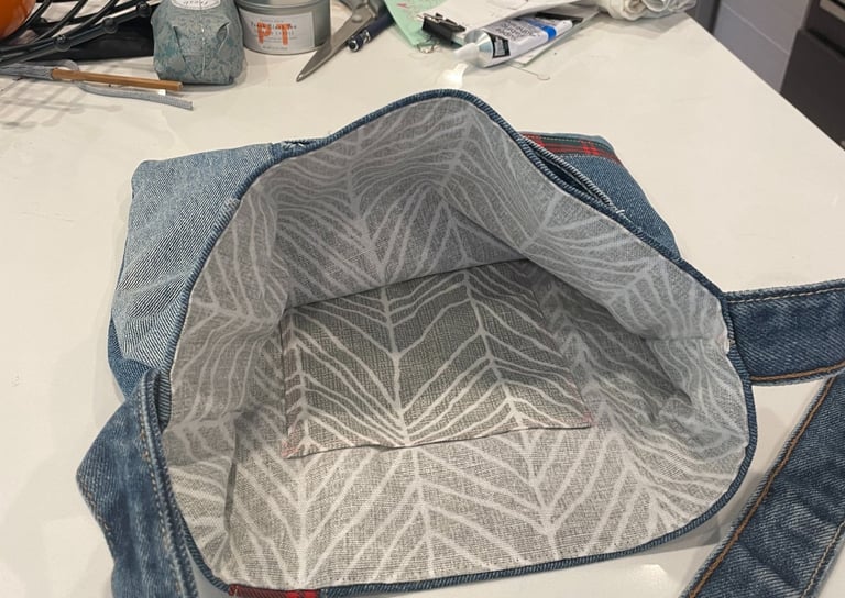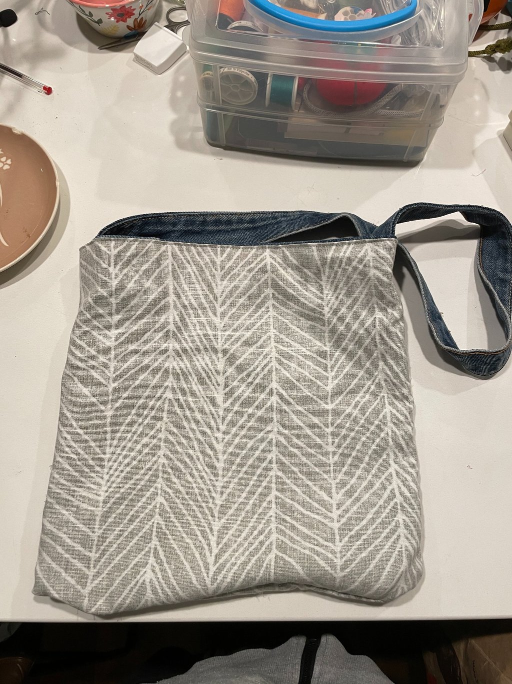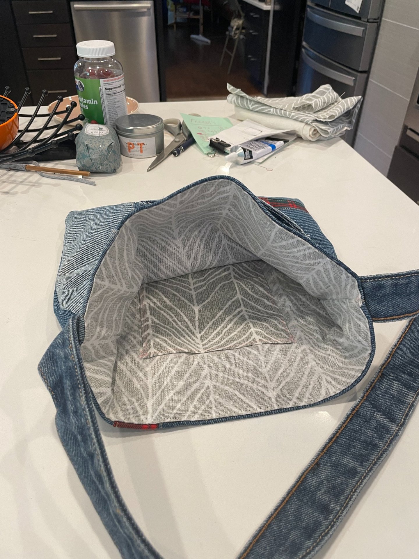 For the lining, I first completed sewing the denim tote bag, along with the embroidery and the strap. Then, I sewed the grey polyester fabric into a basic bag shape, and sewed the top edge inwards so the stray threads were tucked in. I turned it inside out, put it into the denim bag, then completely sewed the top edge with the denim. To make sure the lining stayed in place, I hand-sewed the bottom portion to line up with the edges.