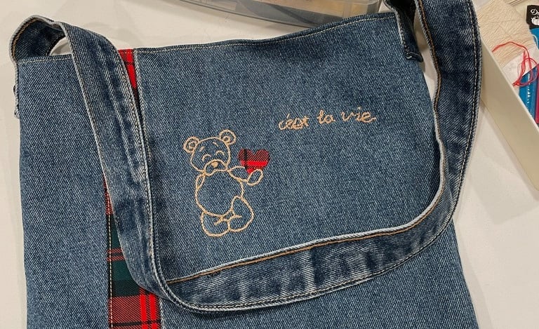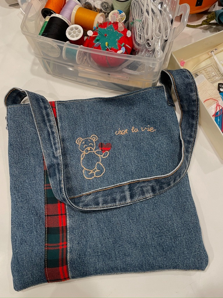 I felt there was something missing on the large blank space on the front of the bag, so I decided to embroider a little message- "c'est la vie". My friend knows a bit of French, so I thought it was fitting. I also embroidered a bear holding a heart in the same plaid fabric. Perhaps he ripped it out of the bag. Or his heart. Anyways.