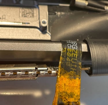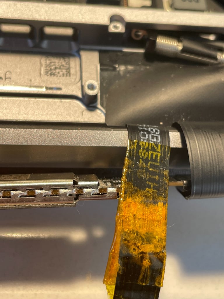 The band of electronics connected to the display 'clicks' into the base. Three black strips of varying widths are all that connect the display with this band. These strips bend as the laptop is opened and closed, and with repetitive strain, they have potential to break, thus breaking the connection of the minuscule copper wires inside (shown under microscope). The backlight strips in the 2016 Macbook Pros were not long enough and are pulled too taut when the laptop is opened, greatly increasing risk of breakage. You would think Apple could've spared a couple extra millimeters of copper.