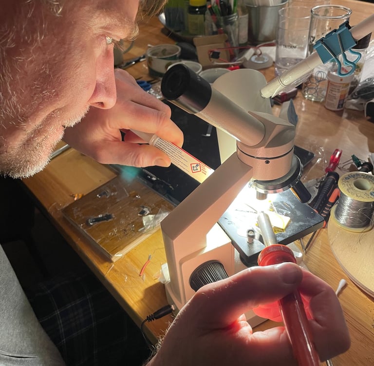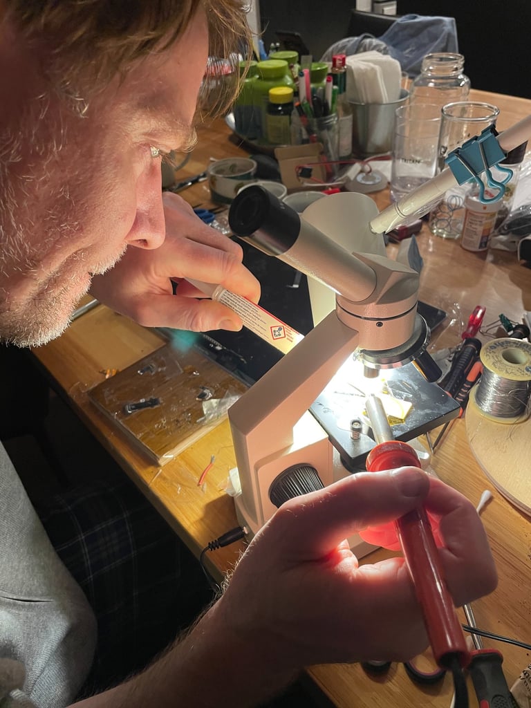 Pictured is a practice strip. This is microscopic work and I didn't want to mess up on the important bit. I scraped off the black coating to reveal the copper, then used flux to solder each individual wire together.